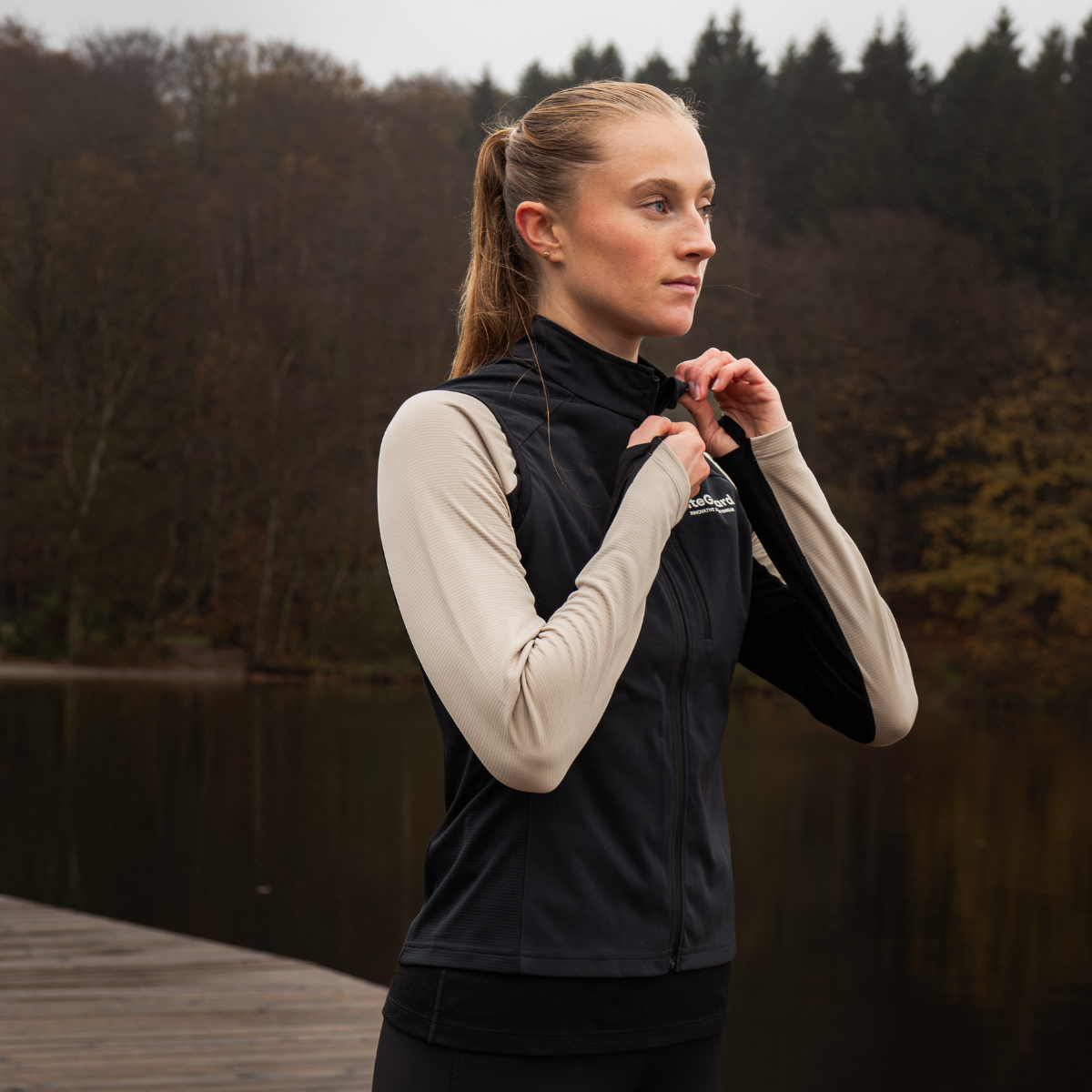 Mellemlag: Temperaturregulerende og fleksibelt. En let langærmet løbetrøje med lynlås i halsen (GROUND-TECH 1/4 ZIP SHIRT) giver mulighed for ventilation, når solen bryder frem.