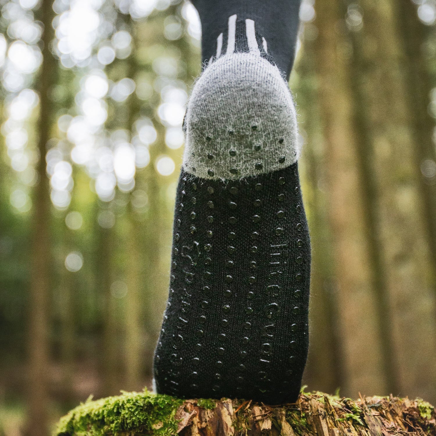 MERINO SHIN-TECH-strømpens sål har en punktvis silikonebelægning, der går fra forfoden til bagsiden af hælen. Denne belægning skaber en lille friktion mod skoens sål, hvilket giver dig et mere stabilt fodfæste og en bedre føling med både sko og underlag.