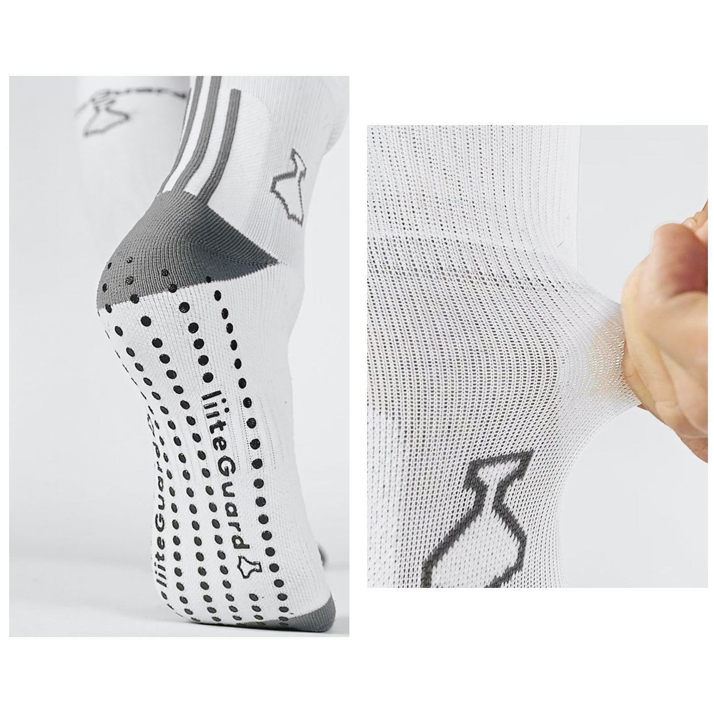 Denne fodboldstrømpe med kompression er udviklet til at støtte din akillessene, der ofte er udsat for konstante vibrationer under fysisk aktivitet. Gennem øget kompression direkte på akillessenen mindskes eventuelle smerter under og efter din aktivitet, og hindrer samtidig mulig hævelse.