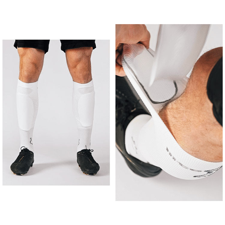 Strømpen er udstyret med en indvendig lomme, som holder din benskinne på plads uden brug af strømpetape eller underwrap. Lommen har en nedre begrænsning, som gør, at din benskinne aldrig vil glide ned. Samtidig gør den generelle kompression i strømpen, at benskinnen bliver siddende stabilt, uanset hvor meget du løber, sparker og tackler.
