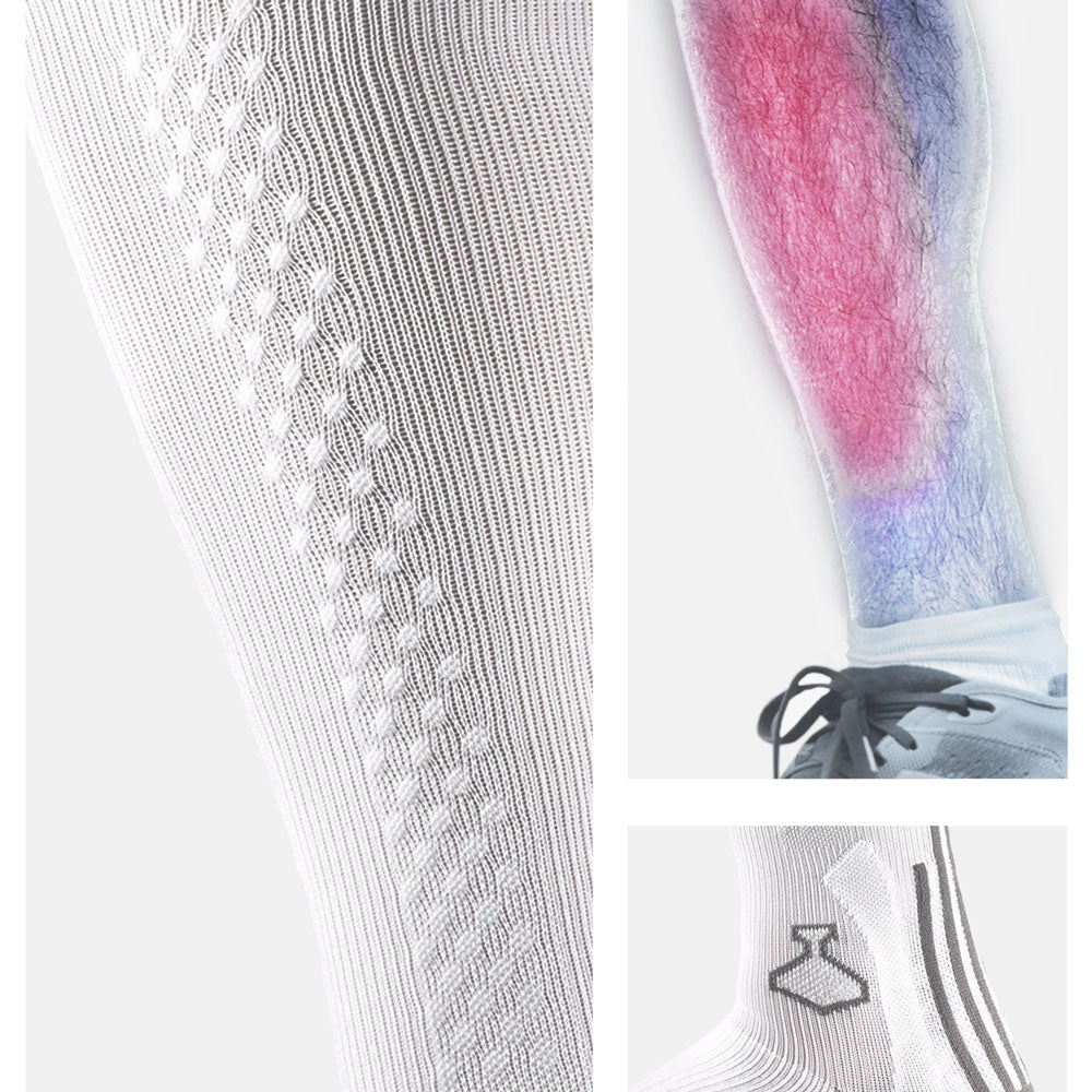 Kompressionsstrømpe velegnet til løberen, der vil præstere maksimalt hver gang. Strømpen er udstyret med et innovativt silikonemønster langs skinnebenet, der stimulerer blodflowet og forebygger skinnebensbetændelse. Desuden sikrer den skridsikre sål et fast greb i skoen, så du undgår vabler og blå negl.